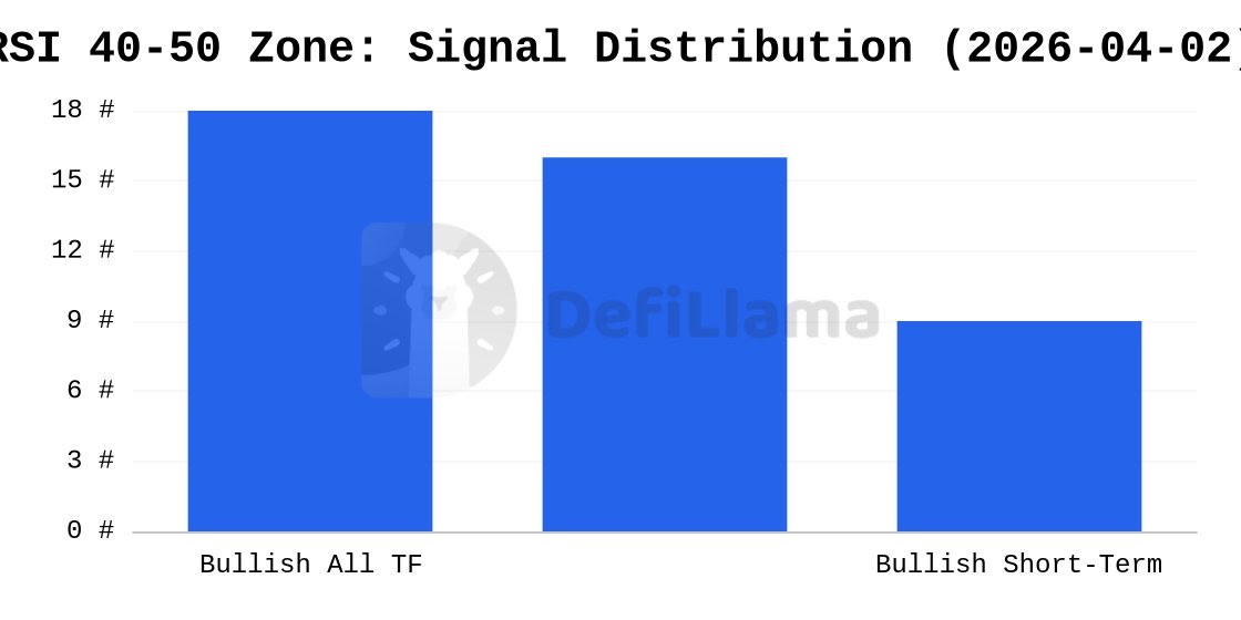 스캔된 68개 토큰 중 43개가 RSI 수치가 40–50의 중립적 횡보 구간에 있습니다. 이는 시가총액 상위 집단의 63.2%를 차지하며—3월 31일의 36.8%에서 크게 상승한 수치로, 짧은 약세 이후 빠르게 횡보 구간으로 재진입했음을 보여줍니다.