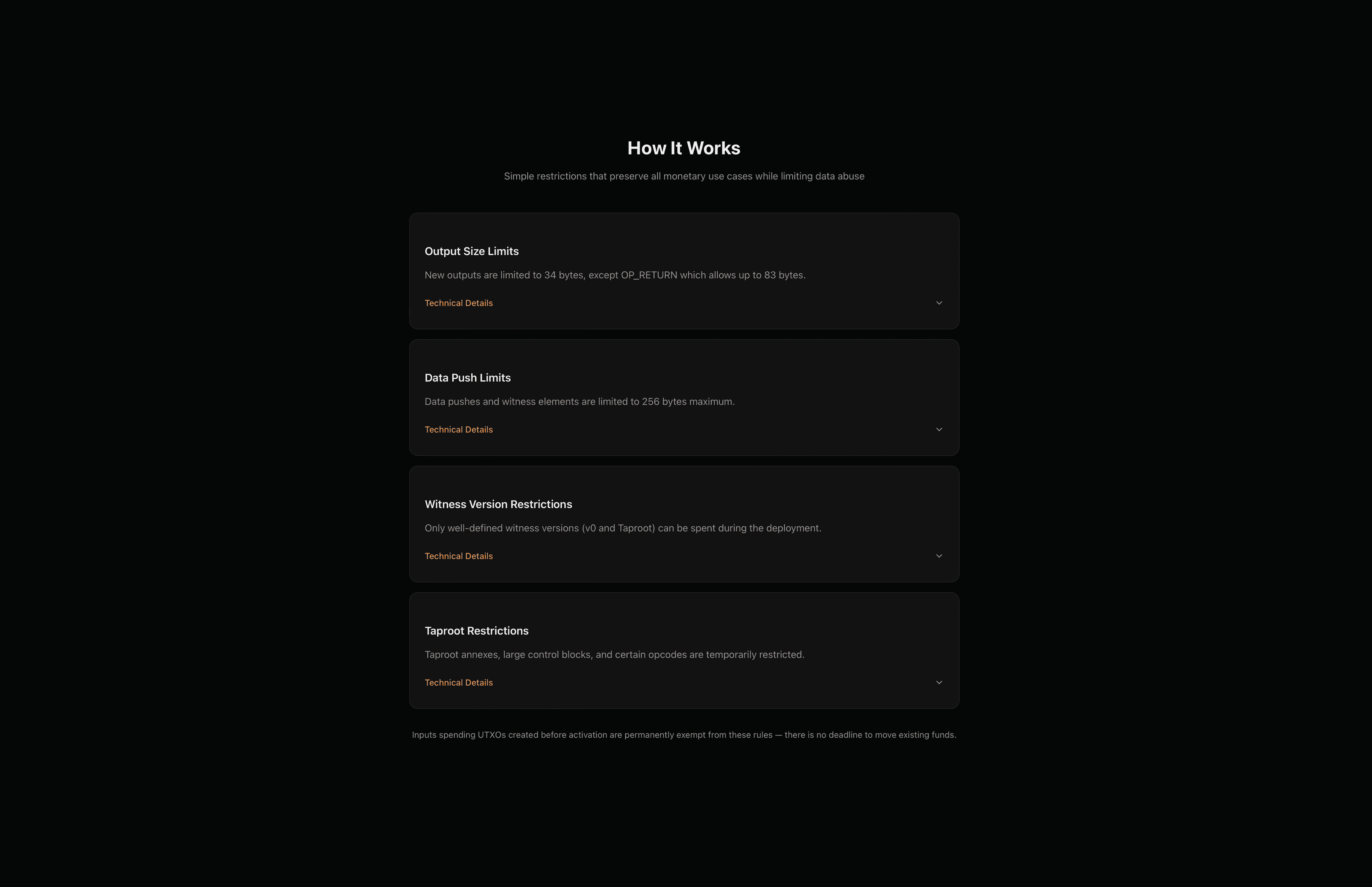 BIP-110 proposal: Advanced primarily through Bitcoin Knots by Luke Dashjr, BIP-110 proposes a time-limited soft fork lasting approximately 52,416 blocks (roughly one year), imposing tighter consensus limits — OP_RETURN capped at 83 bytes, transaction outputs restricted to 34 bytes, witness elements limited to 256 bytes, Taproot annexes invalidated, control blocks capped at 257 bytes (limiting script trees to 128 leaves), and OP_SUCCESS and certain OP_IF/OP_NOTIF tapscripts disabled, after which nodes automatically revert to pre-activation rules without manual intervention.