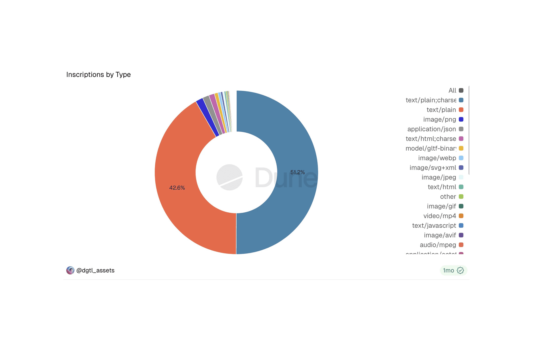 Text and code (just over 50%): Plain text messages, program code, HTML, JavaScript, and JSON data used by BRC-20 tokens accounted for the largest share of inscriptions.