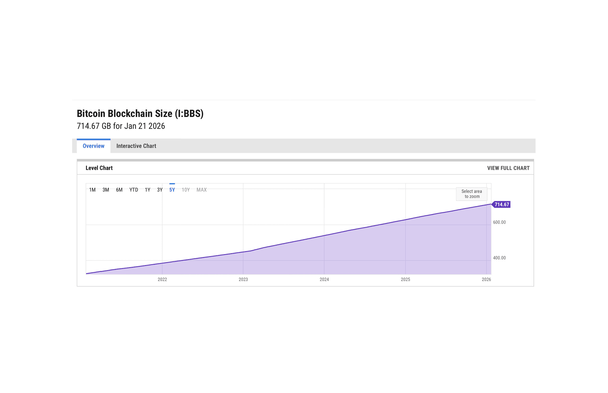 Chart showing Bitcoin blockchain size growth 2022-2026 | Source Ycharts
