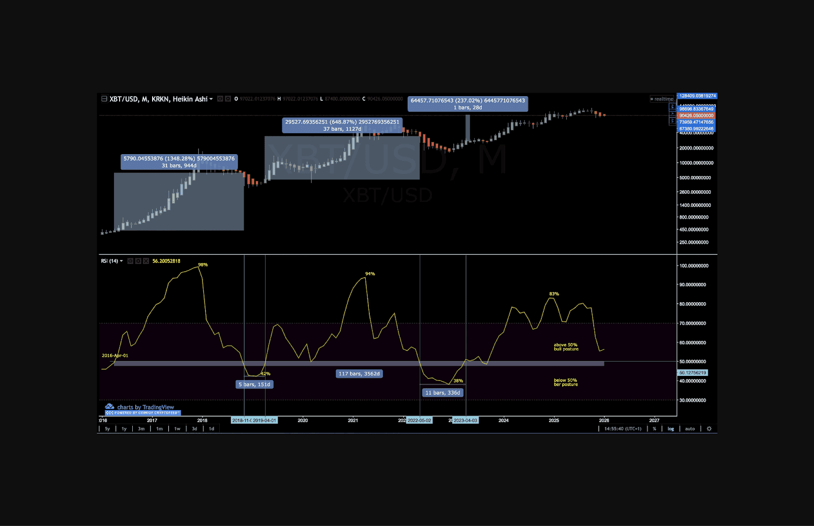 As long as monthly BTC RSI holds above ~49, Bitcoin remains in a bullish structural posture based on historical data going back to 2016. From that perspective, higher prices +-10% moves or sideways action are likely and acceptable. No action is required, and forcing trades out of boredom is rarely productive.