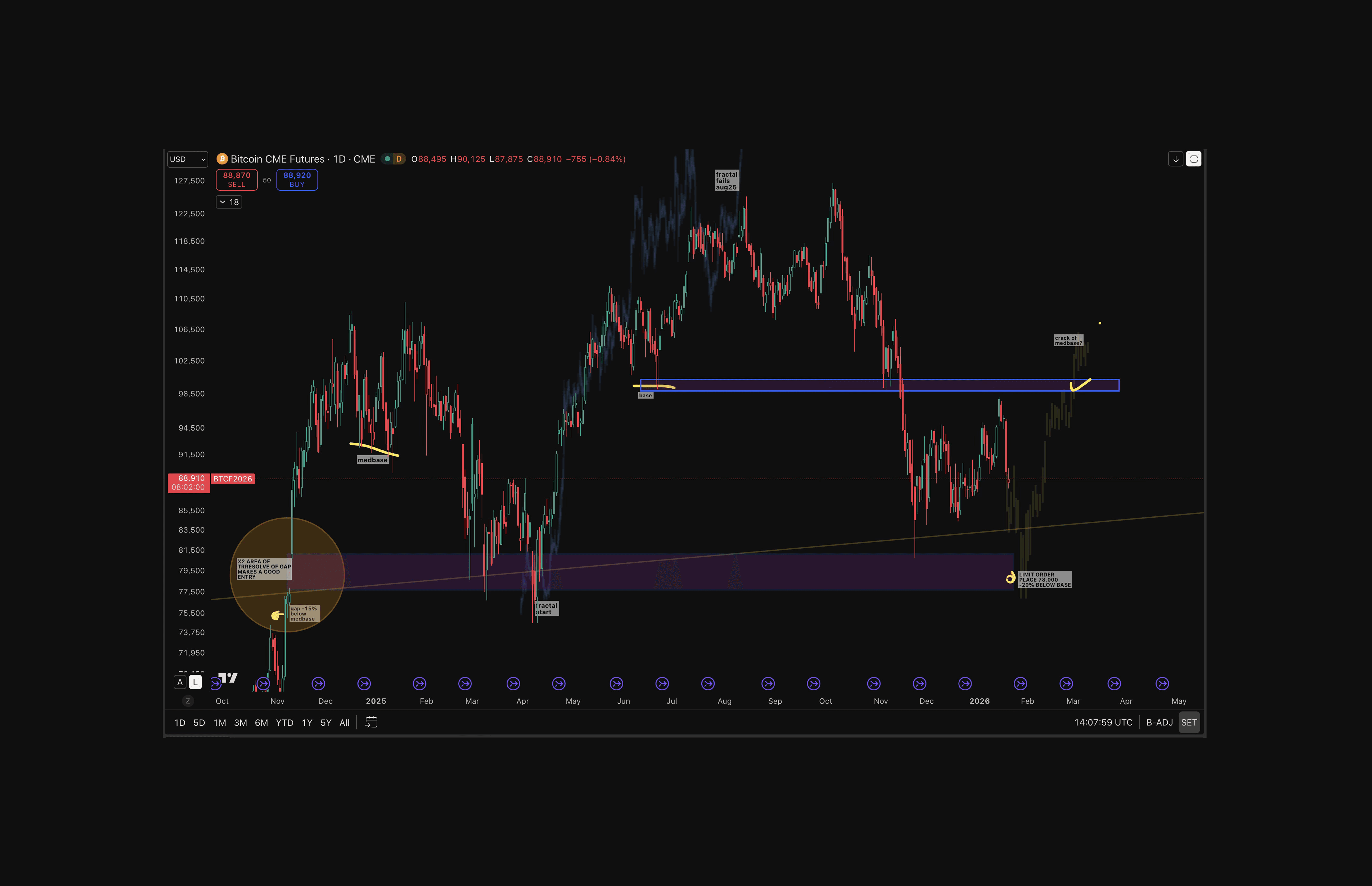 Looking from the left side of the chart to the right side of the chart on top, a CME price gap formed in November 2024 on the daily timeframe (highlighted by the circle). Bitcoin jumped from roughly $76,000 to $80,000 in a single session, leaving no candle activity in between. What happened was it later consolidated around a $90,000 “medium base” level. Later cracking that base to refill the CME gap.