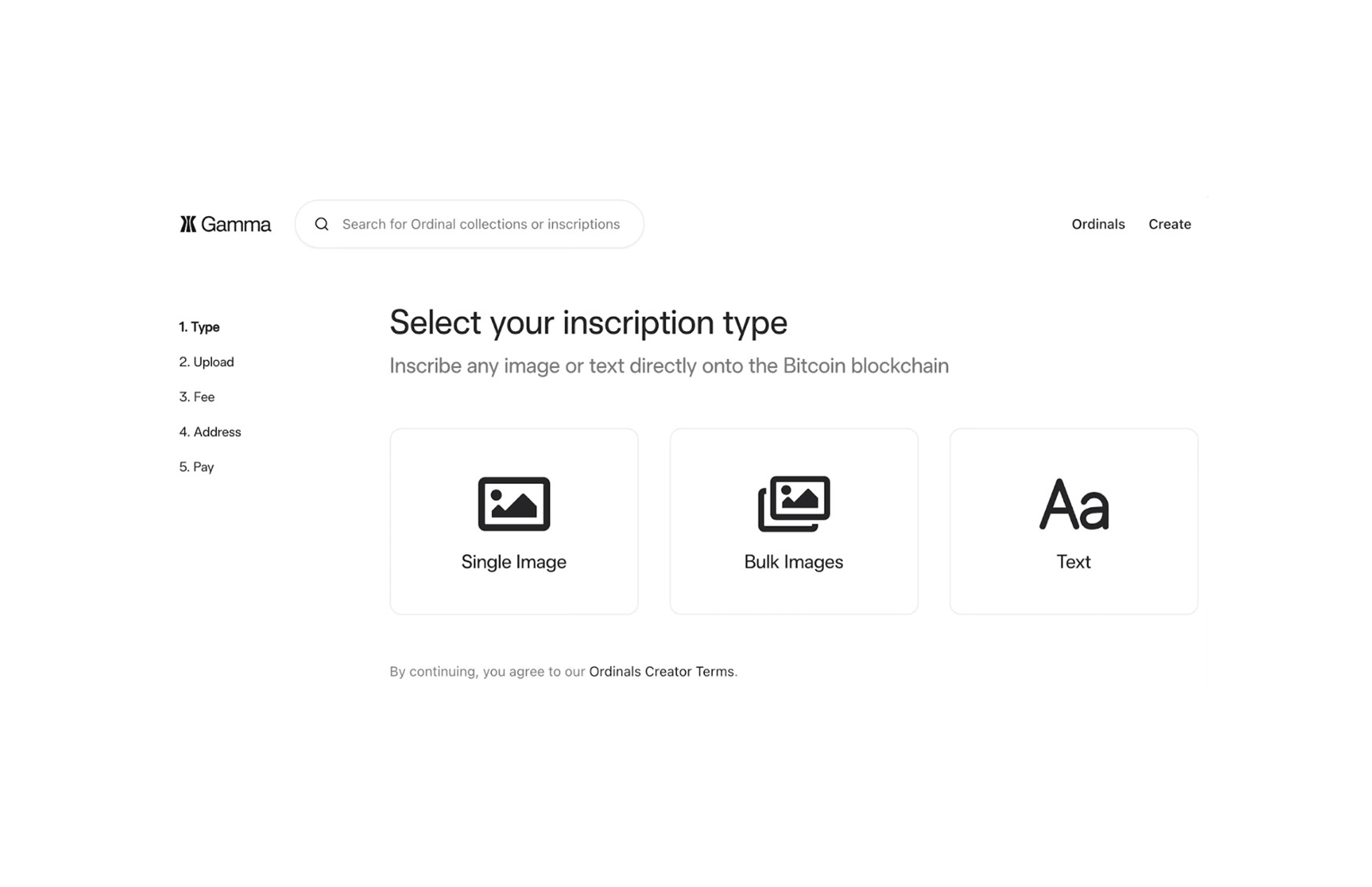 Website to upload inscriptions | Source: https://ordinals.gamma.io/create