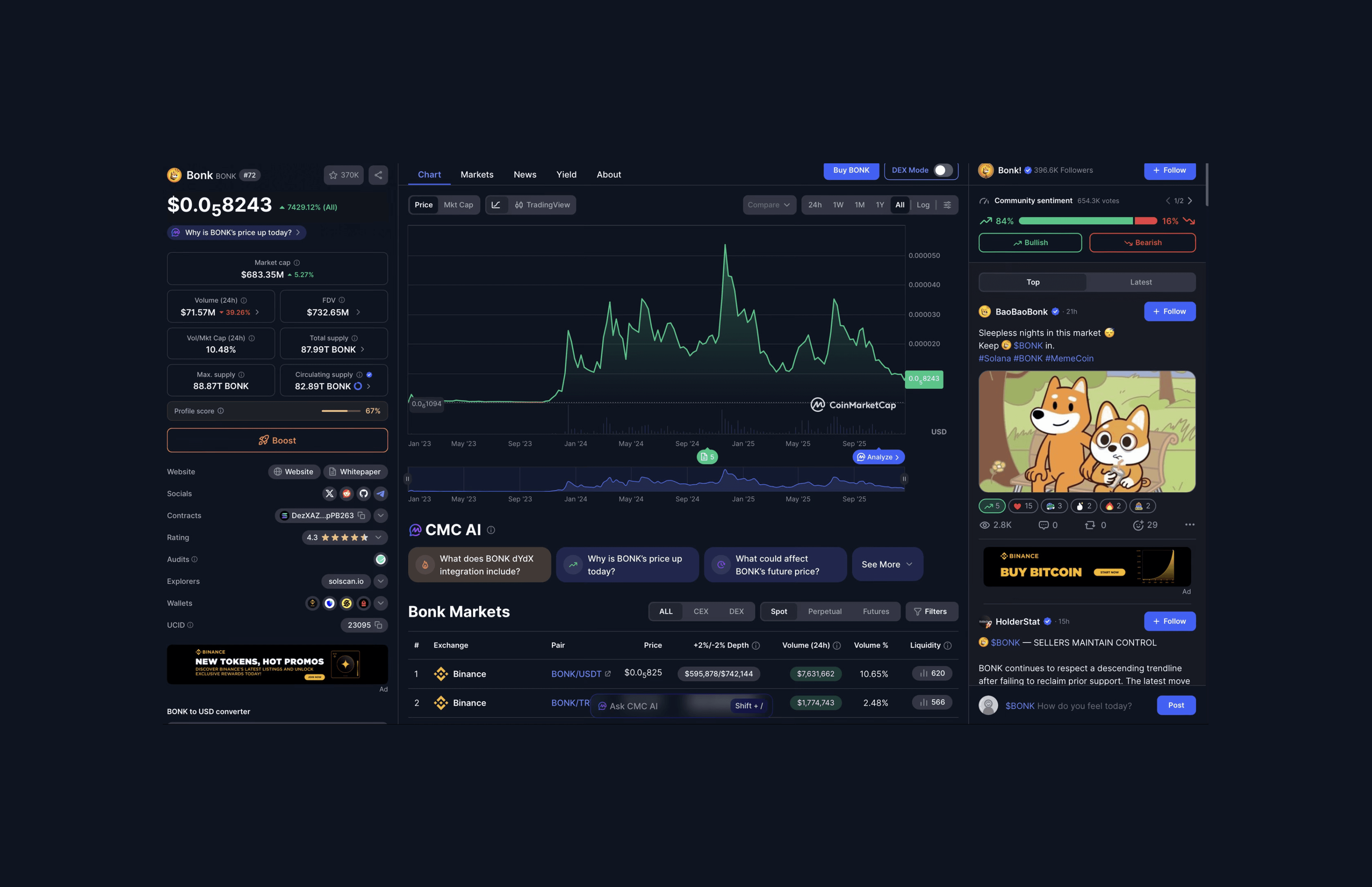 Circulating supply: 82.89 trillion BONK available for trading (~94% of max supply)
