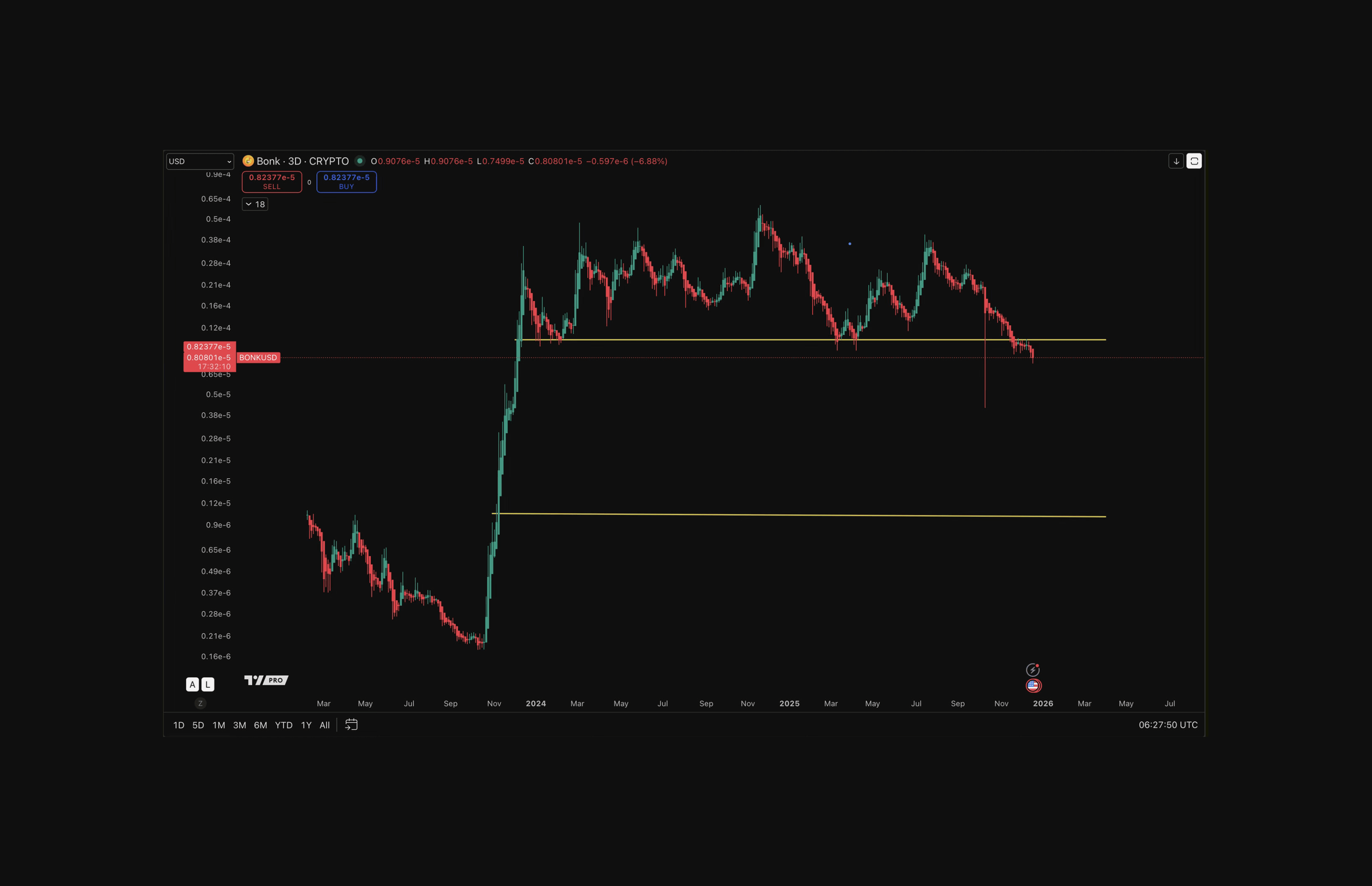 BONK price full history in log format till December 20, 2025