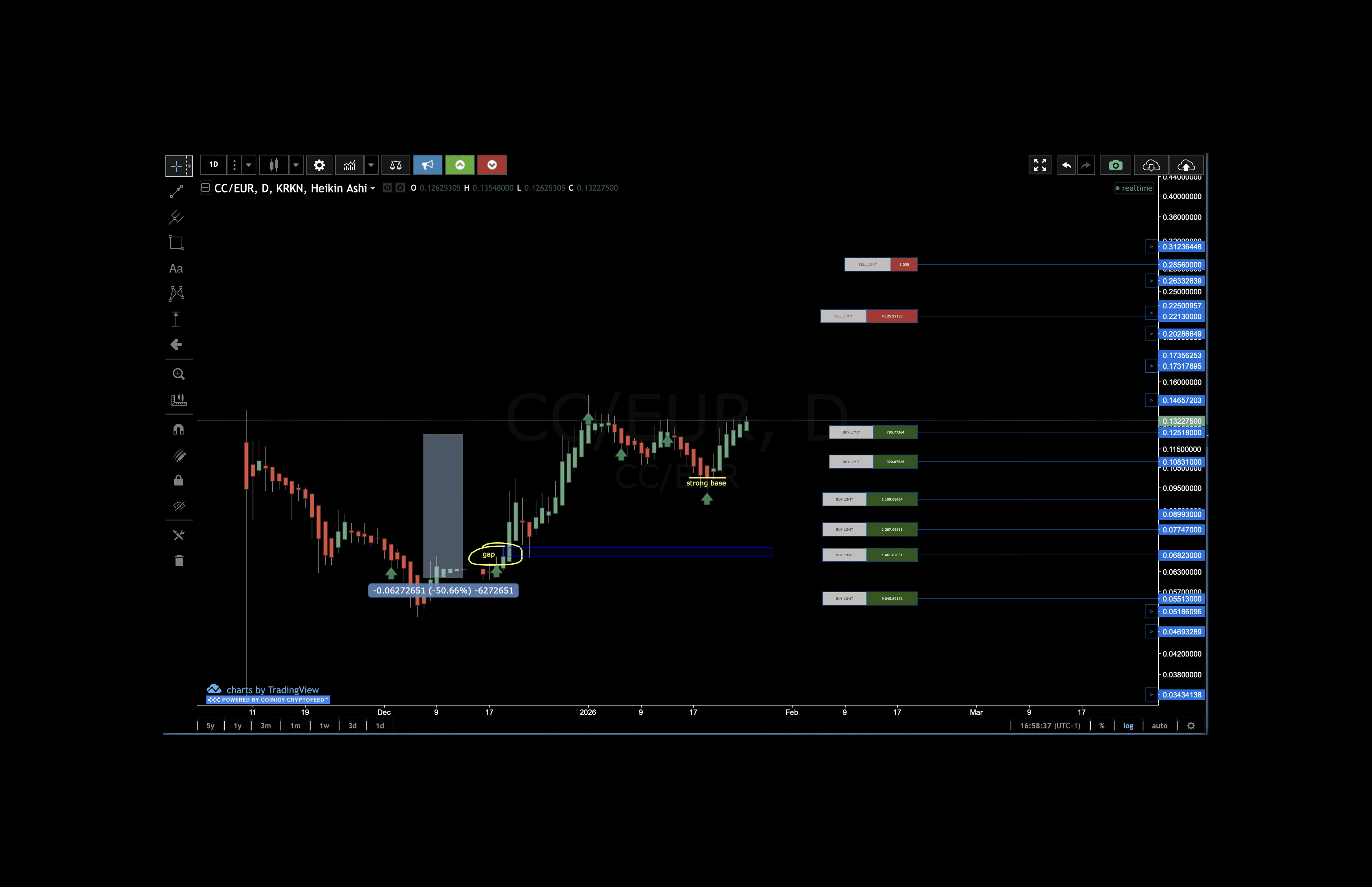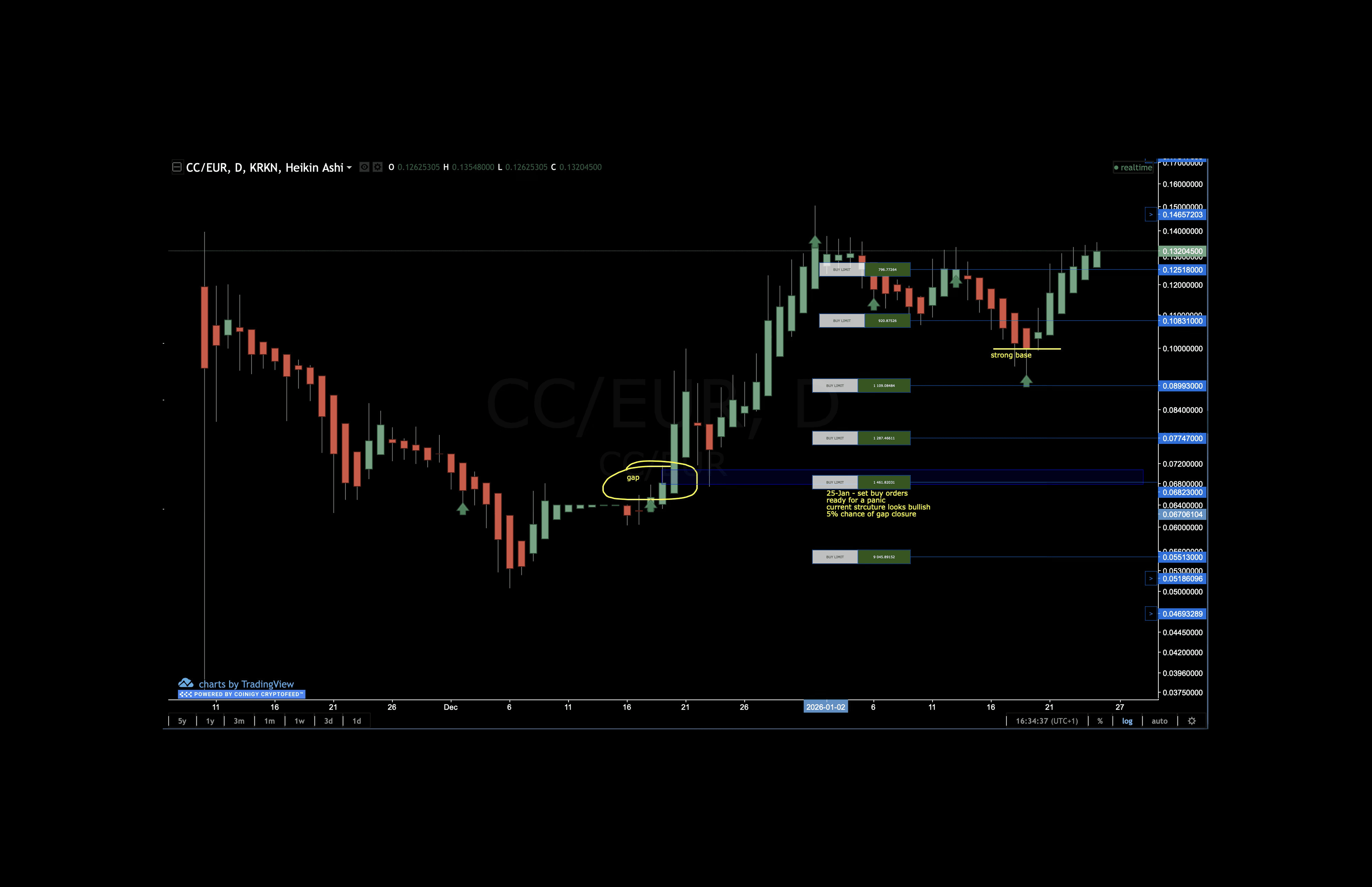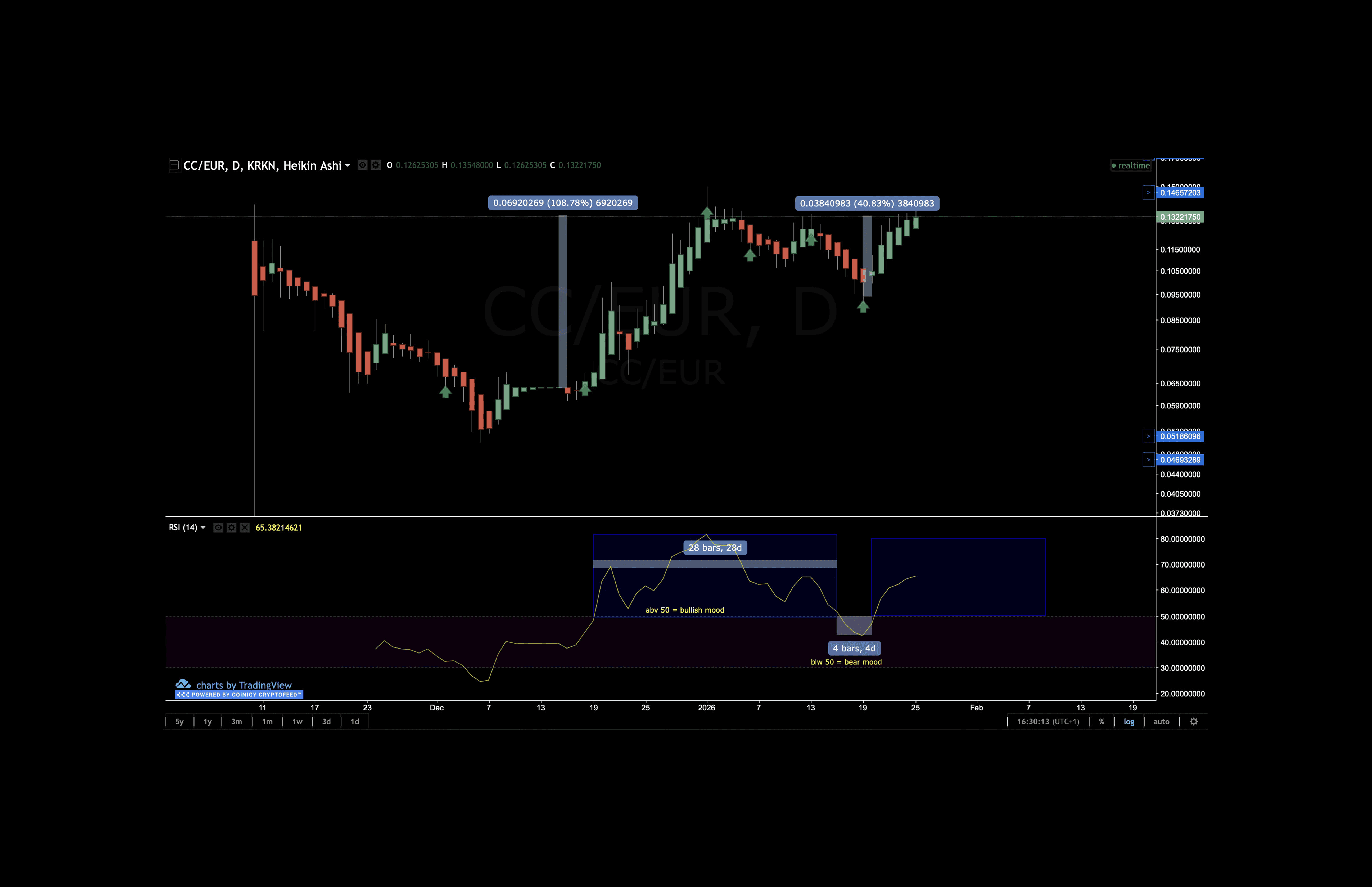 The daily chart shows CC/EUR consolidating around €0.13. After a long downward consolidation at the end of 2025, from local lows, price has since rebounded into 2026 and now appears positioned for price discovery.