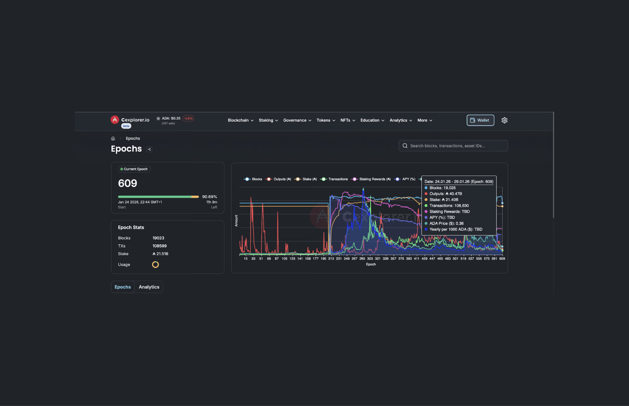 Live network data showing current epoch progress, slot leadership distribution, and block production activity across Cardano's validator network | Source: cexplorer.io