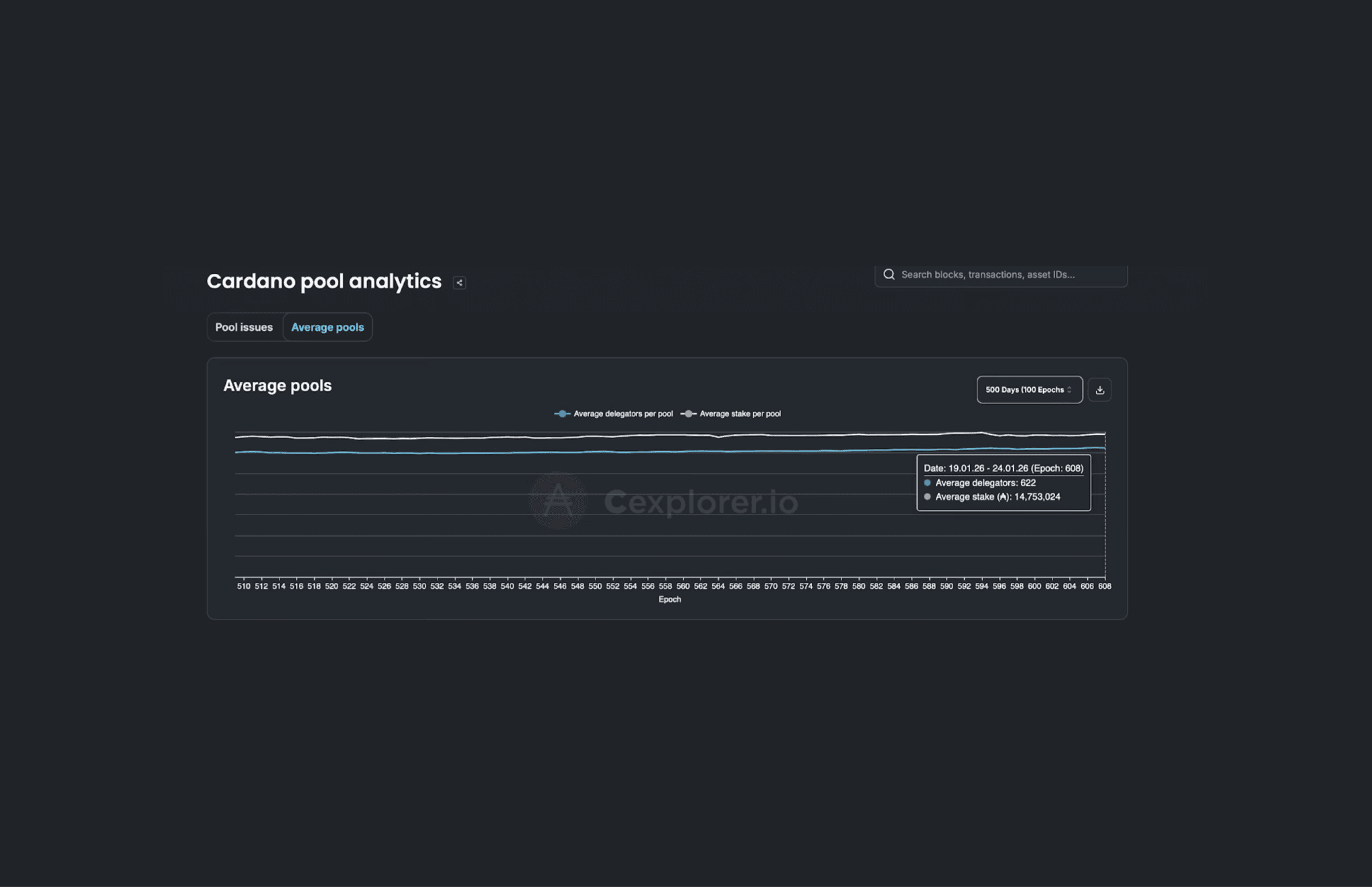 Across the last 500 days, or the observed period in the Cardano pool analytics chart above, average stake pool characteristics remained broadly stable, with only modest changes in participation and stake distribution: