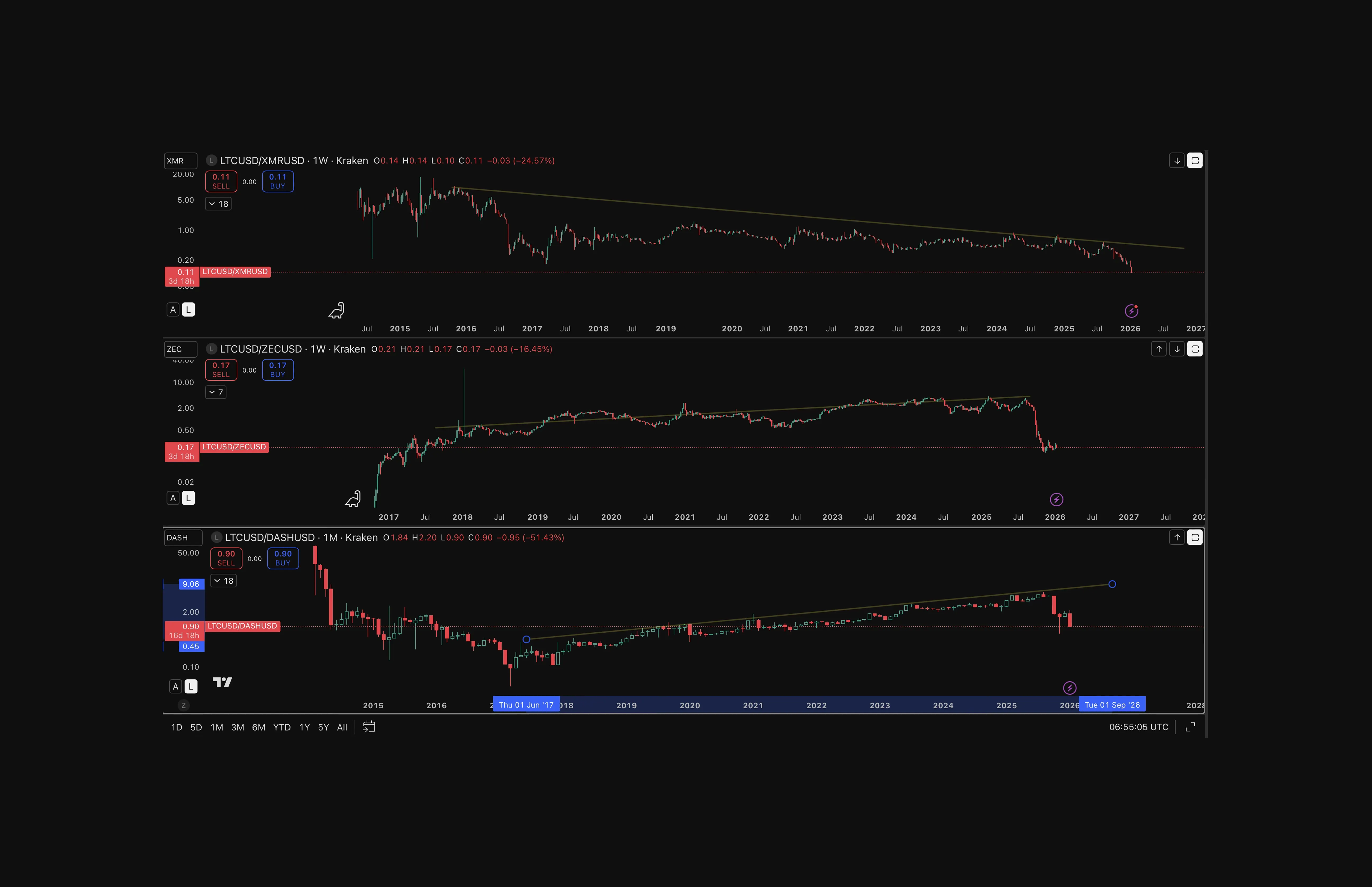 XMR (persistent downtrend): The LTC/XMR ratio has remained in a sustained multi-year downtrend dating back to 2015, reflecting Monero's entrenched role as the leading privacy-focused asset and the market's slower repricing of Litecoin's optional privacy enhancements.