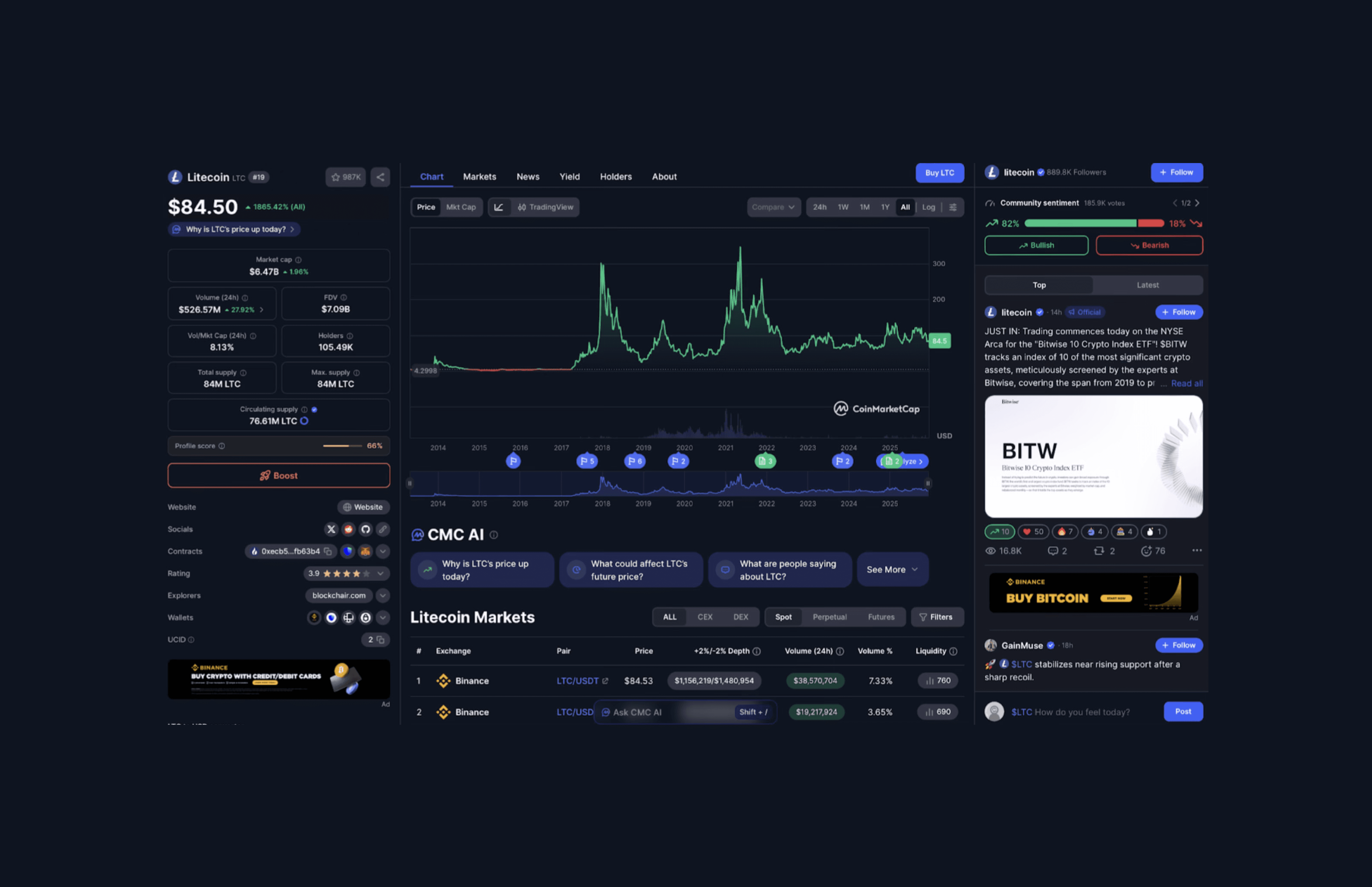Litecoin trades around $84 with a market cap near $6.5 billion and 76.61 million LTC in circulation on December 10, 2025.