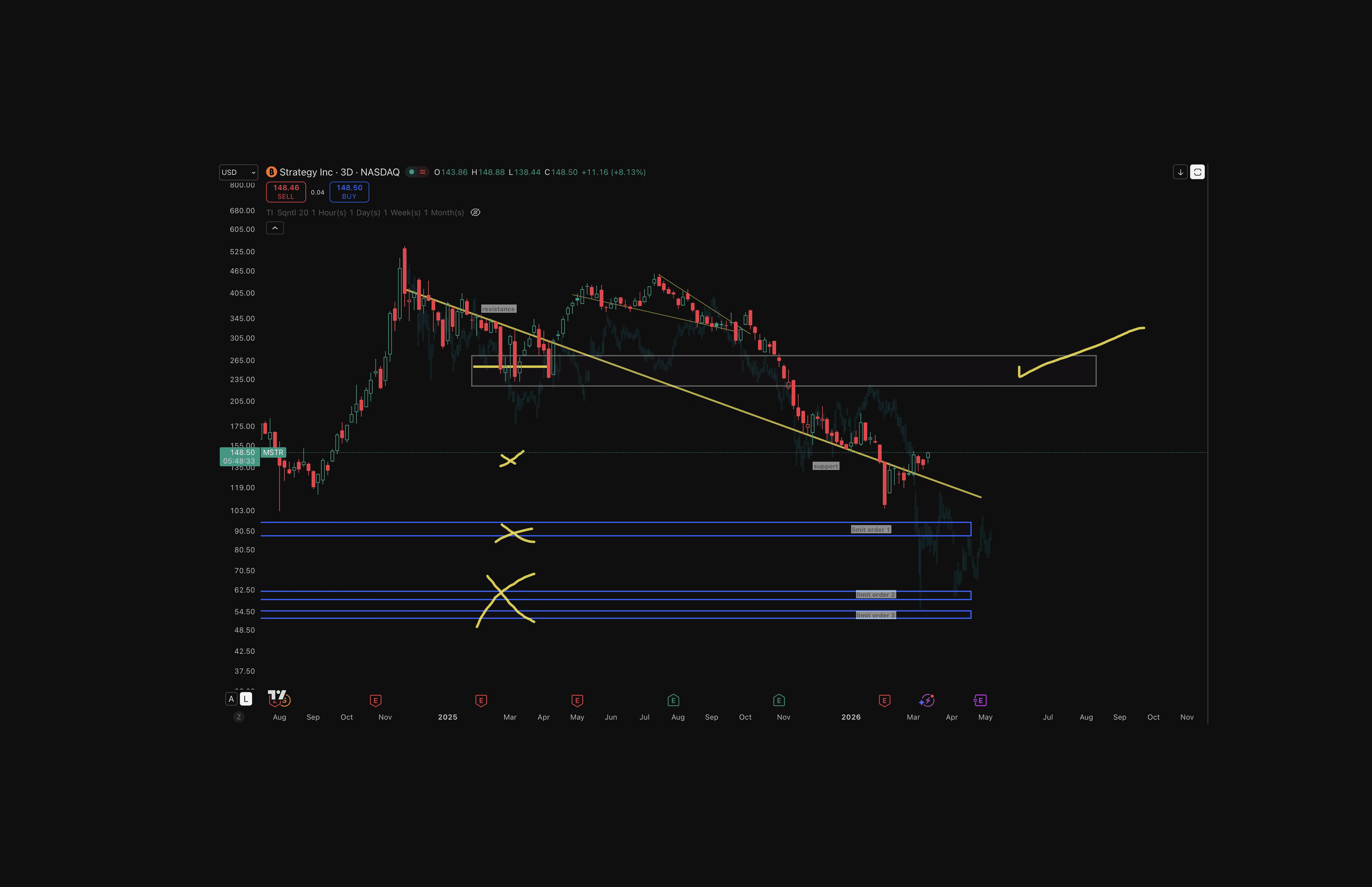 Not capitulating, showing signs of basing and resolving upward. Strong base at $220–$252. Since MSTR tends to front-run Bitcoin, its strength is a positive signal for BTC. RSI on MSTR also holding around 40, which supports the bullish case.