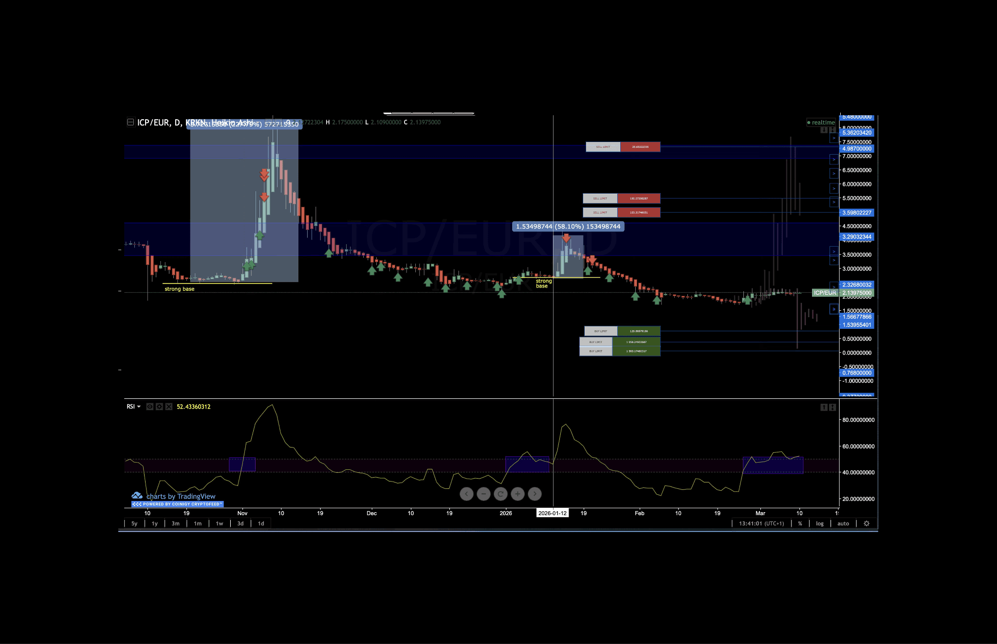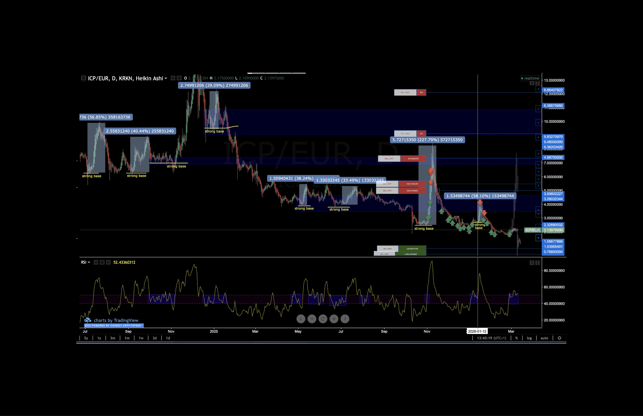 ICP trades around $2.52 with RSI at 52, which has just crossed back above 50 for the first time in months. Price is below eight visible bases, so sell limits are stacked above into prior resolution zones, while buy limits are positioned below for any retest. Keeping RSI above 50 on a closing basis is the key bullish signal being watched.