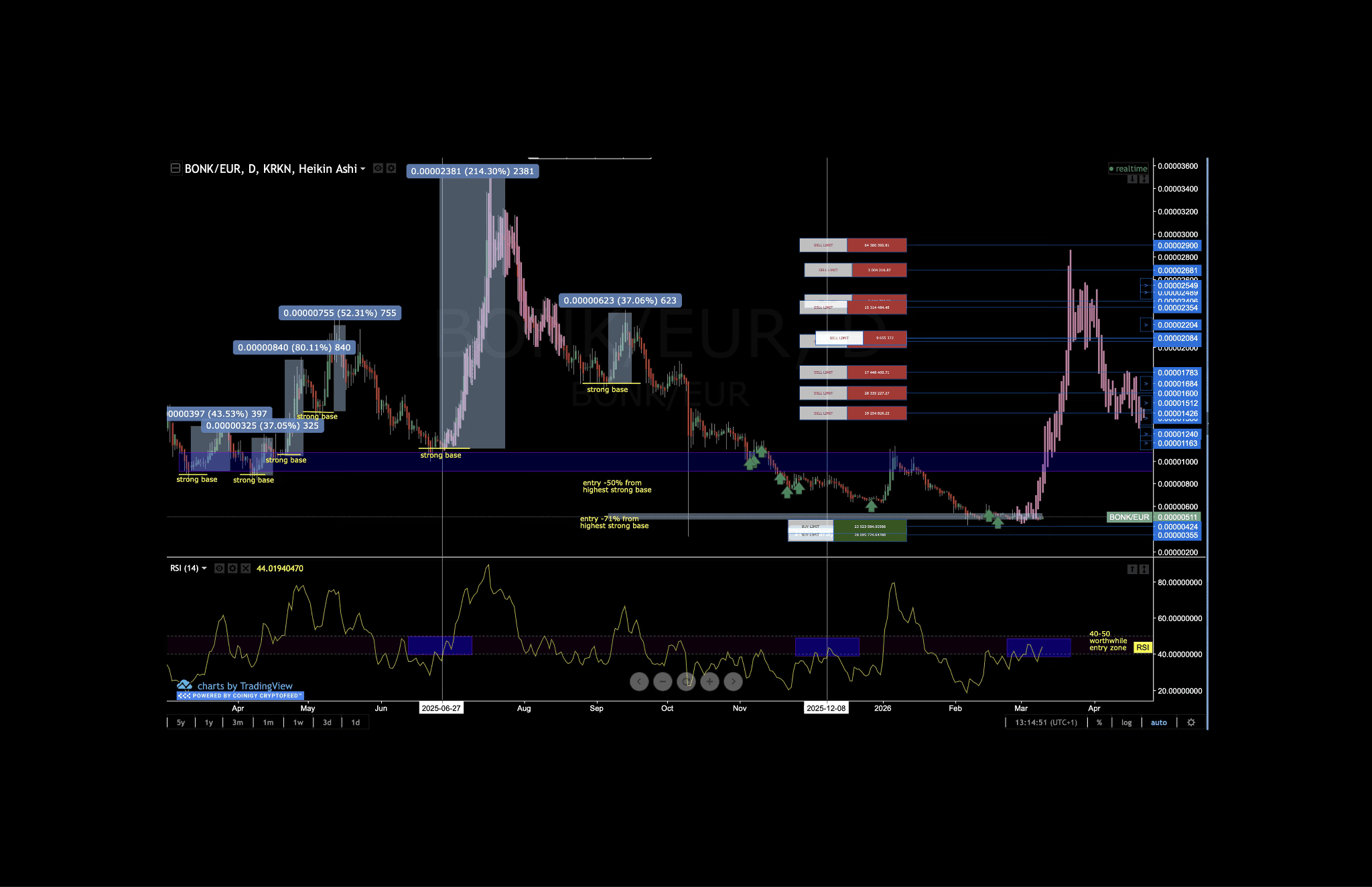 BONK has a daily RSI of 44 in the 40–50 zone, with price below multiple strong bases built across 2025. Sell limits are staged above current price into those prior base levels, and bounces are treated as distribution opportunities until RSI can reclaim and hold above 50.