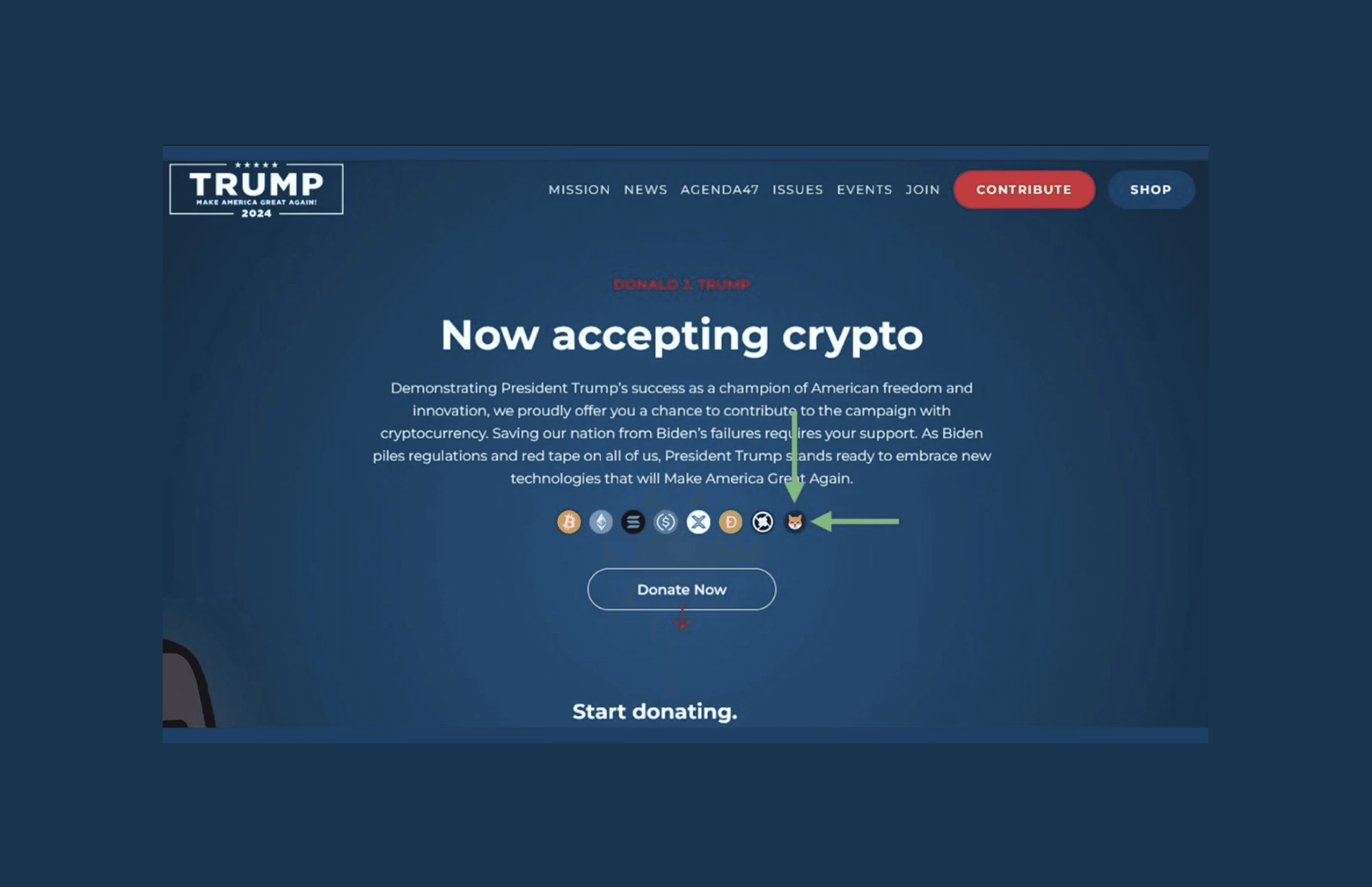 Notably, SHIB has appeared among accepted cryptocurrencies for political fundraising associated with U.S. presidential campaigning, including initiatives linked to Donald J. Trump's 2024 campaign ecosystem.