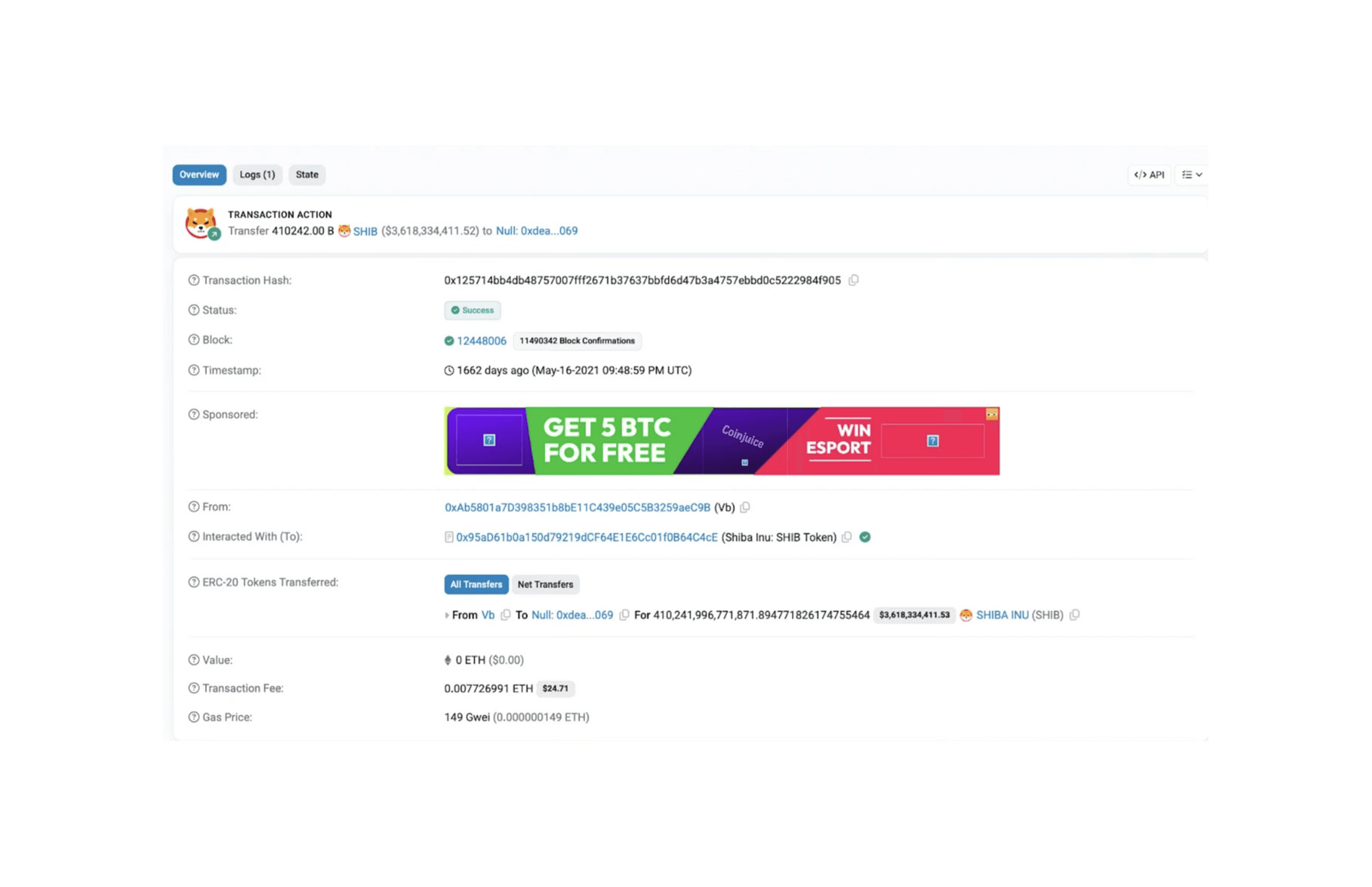 Vitalik Buterin burn: Around 410 trillion SHIB were permanently burned in May 2021 after being sent to his wallet.