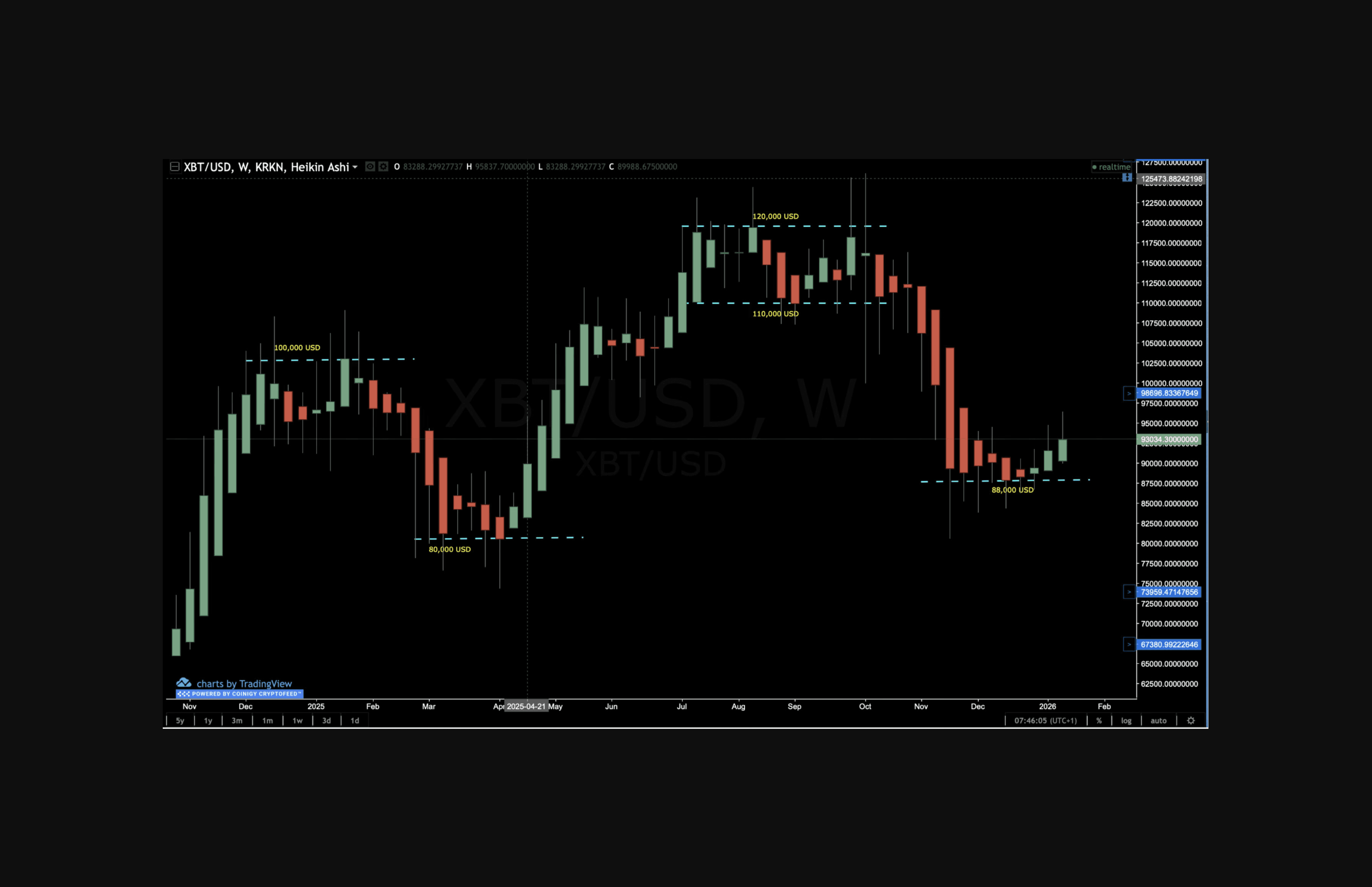 Support and resistance forming around key psychological round numbers on BTC weekly timeframe
