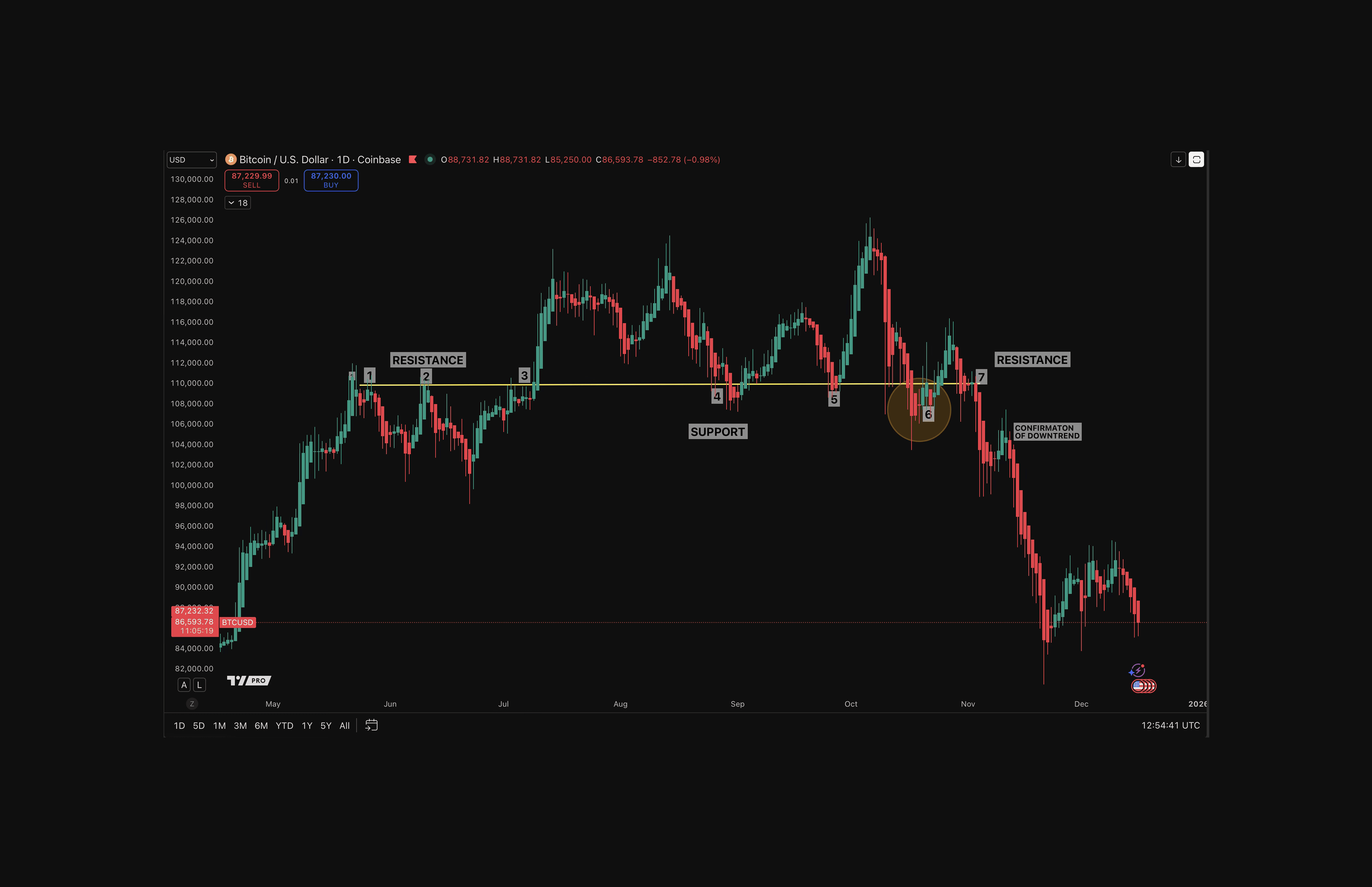 Earlier in the trend, the same yellow level function acted as support (4-5). Traders who sold too early during the prior advance look to re-enter when price revisits the support zone, expecting price to hold again. That buying interest initially slows declines but once the level fails decisively, that demand disappears, confirming a shift in market structure and leading to the sharper downside move that follows. Support flips to resistance.
